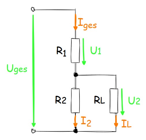 Sobald eine Last RL an den Spannungsteiler angeschlossen wird, verändert sich die Schaltung grundlegend: